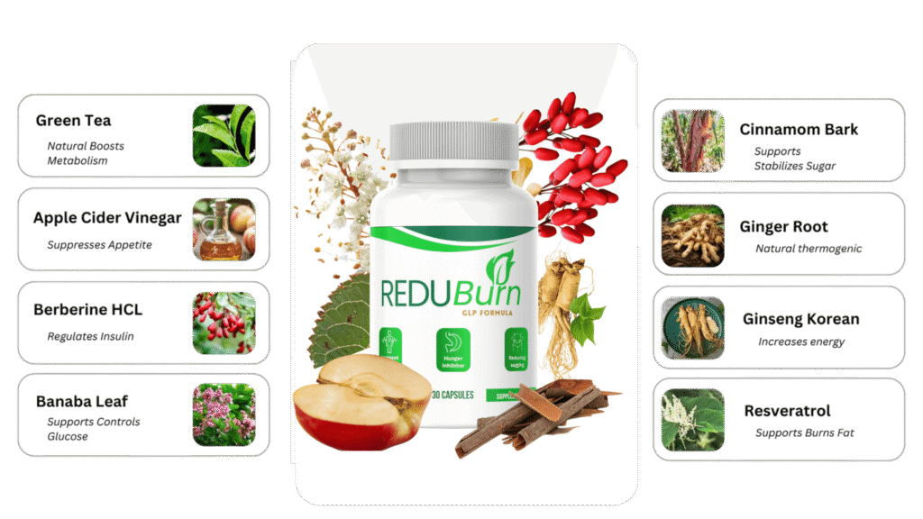 The ingredients in ReduBurn are carefully selected for their ability to promote healthy fat burning, support glucose metabolism, reduce inflammation, and address common challenges caused by stress, hormonal shifts, or slow weight loss.